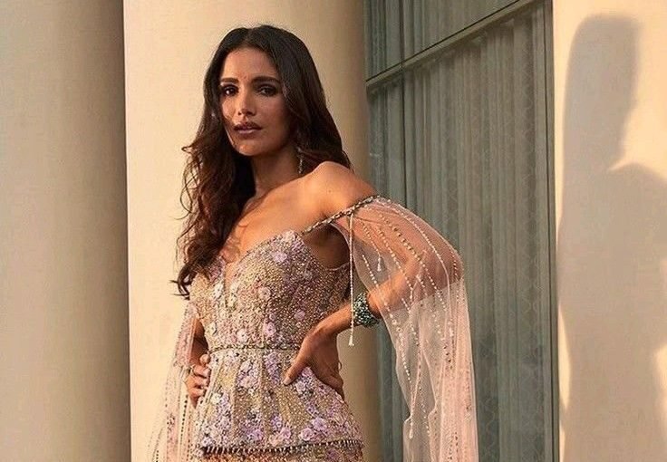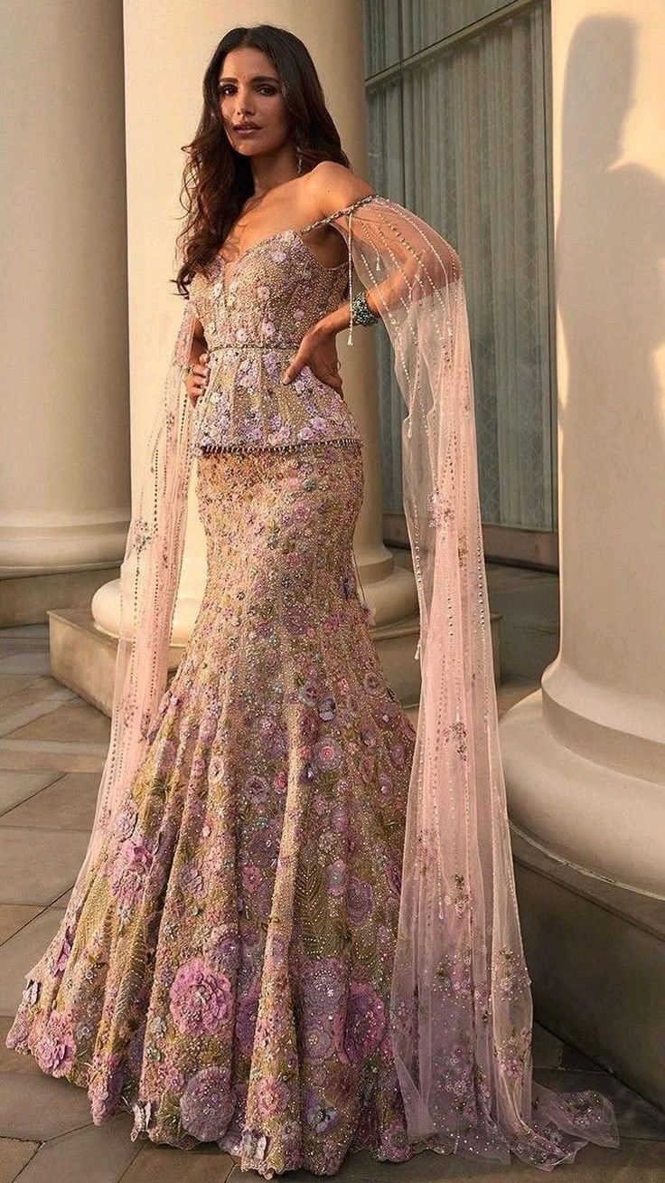 This unique bridal look brings together the best of both worlds: the intricate detailing of traditional Indian attire with the refined silhouettes of Western couture. Imagine a high-waisted lehenga skirt in soft rose silk paired with a structured crop top, an embroidered cape cascading over tailored trousers, or a modern sharara with a sheer organza jacket that glimmers under the light. Whether blush, dusty rose, baby pink, or champagne-rose, the color palette radiates femininity while making a chic, unforgettable statement.