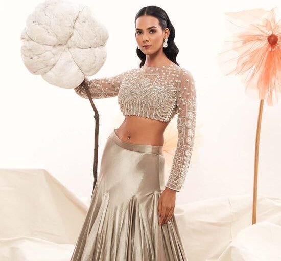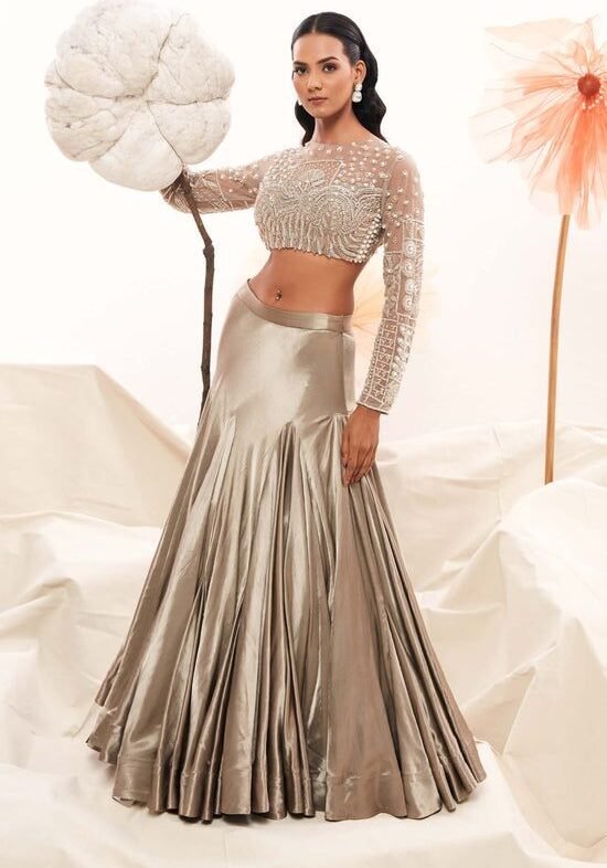 Paired with a luxuriously flared satin lehenga in a metallic champagne gold tone, the outfit flows with fluid grace, giving off an air of regal charm. The soft sheen of the fabric, coupled with the flawless tailoring, ensures that you dazzle from every angle. Whether you’re attending a wedding reception, an engagement soirée, or a festive celebration, this look guarantees a head-turning entrance.