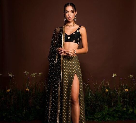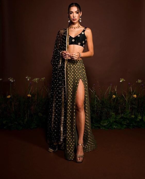 The outfit features a high-slit olive green lehenga skirt, adorned with golden buti work in a classic Indian motif. The fabric’s subtle sheen adds a regal charm, while the thigh-high slit brings a fresh, fashion-forward edge that elevates the traditional form into high-style territory. The silhouette is sharp, sleek, and confident — allowing ease of movement while showcasing a strong, empowered presence.