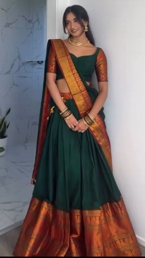 Nothing says regal like a classic Kanchipuram silk lehenga — and this look brings that age-old charm into the spotlight with effortless grace. Featuring a rich emerald green lehenga adorned with a striking rust-orange zari border, this ensemble is a celebration of tradition, heritage, and timeless beauty.
