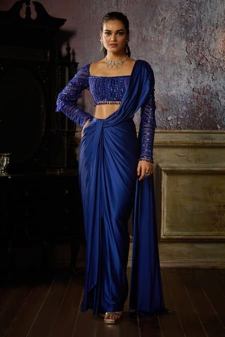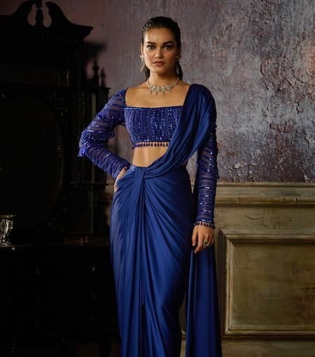 The sleeve design, studded with shimmering elements, adds a sense of strength and sophistication. The blouse’s cropped length offers a flattering contrast to the fluid drape of the saree, creating balance and modern sensuality.