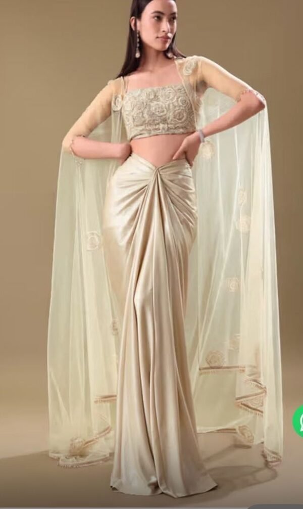 This saree showcases an innovative draping style that hugs the body with sculptural precision. Rather than the traditional pleats and open pallu, the drape is cinched and gathered elegantly at the front, creating a fluid silhouette that flatters every curve. The fabric, likely georgette or a satin-blend, cascades effortlessly to the floor, allowing both structure and movement.