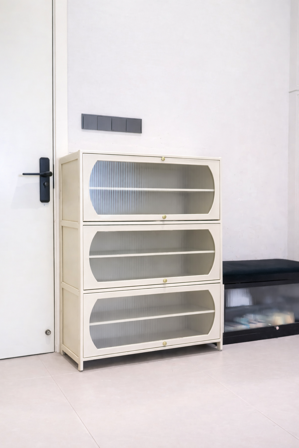 The cabinet features three spacious compartments with transparent ribbed doors, allowing you to easily see the contents while keeping items protected from dust. Each layer provides ample storage space, making it perfect for organizing kitchen utensils, crockery, groceries, cosmetics, books, or everyday household essentials.