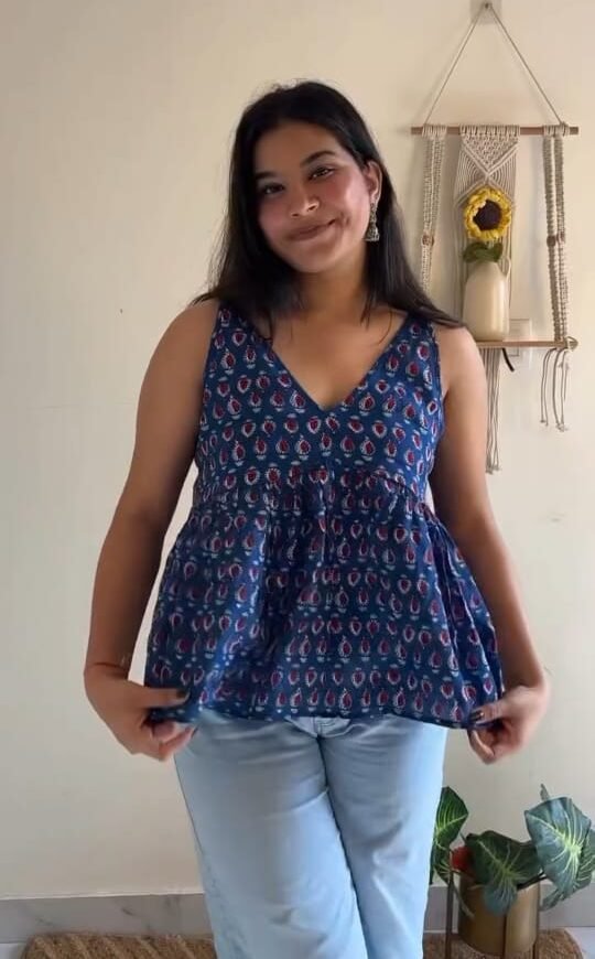 • Description: This chic sleeveless top features a deep blue base with a delicate paisley print. The V-neck design and gathered waist add a flattering silhouette, paired with light blue pants for a comfortable, everyday look. The outfit is set against a cozy indoor backdrop with a sunflower and plant decor, enhancing its relaxed vibe.
