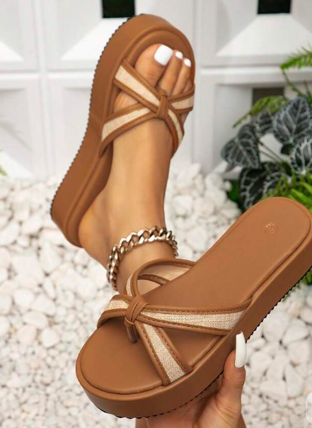 Trendy tan platform slide sandals featuring wide criss-cross straps in contrasting beige and tan tones, accented with a chic silver chain detail across the top. Thick cushioned sole provides extra height and all-day comfort, with an open-toe design perfect for casual summer outfits. Stylish yet effortless, ideal for beach days, vacations, or everyday wear.