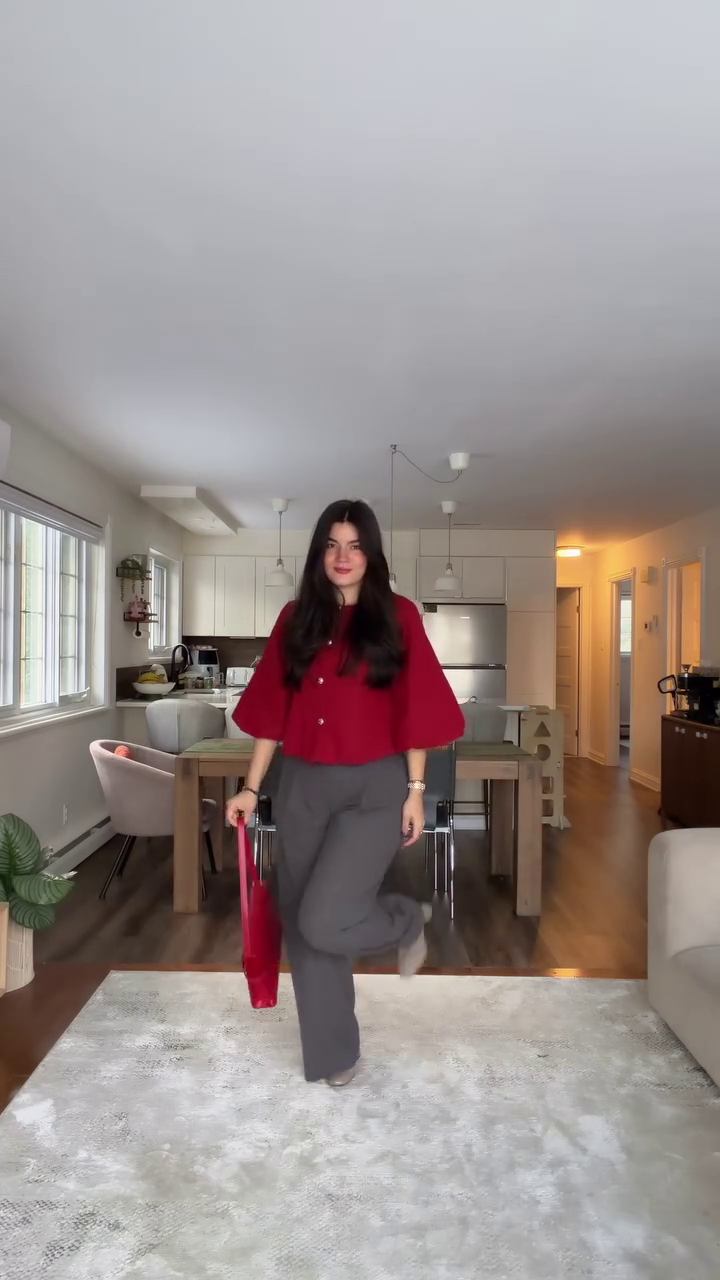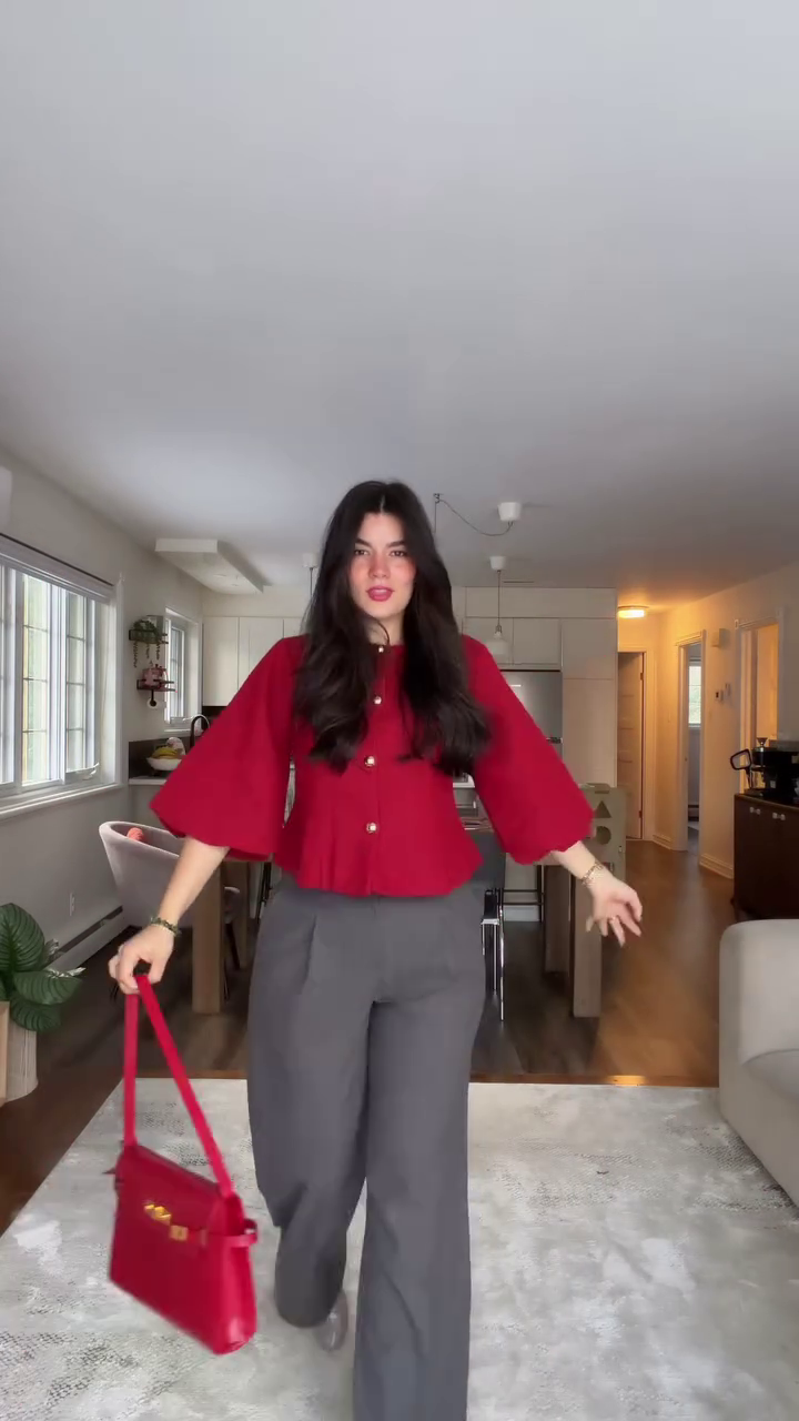 Step into effortless style with this chic red peplum top paired with tailored grey wide-leg trousers — a perfect smart casual outfit for women who love bold color with modern structure. This look blends contemporary fashion with everyday comfort, making it ideal for workwear, brunch outings, casual meetings, travel days, and content-worthy street style moments. The vibrant red top instantly draws attention, while the neutral grey trousers balance the outfit with a clean, polished finish.