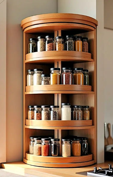 Elegant corner-mounted rotating spice storage unit crafted from warm natural wood (likely oak or bamboo finish), designed to fit perfectly into kitchen cabinet corners. Features multiple curved semi-circular shelves that spin smoothly on a central axis, holding rows of clear glass jars with spices, herbs, and seasonings neatly arranged for maximum visibility and easy access. Space-efficient vertical design maximizes unused corner space while keeping your entire spice collection organized, dust-free, and beautifully displayed in a modern yet timeless style. Ideal for serious home cooks with large spice collections.