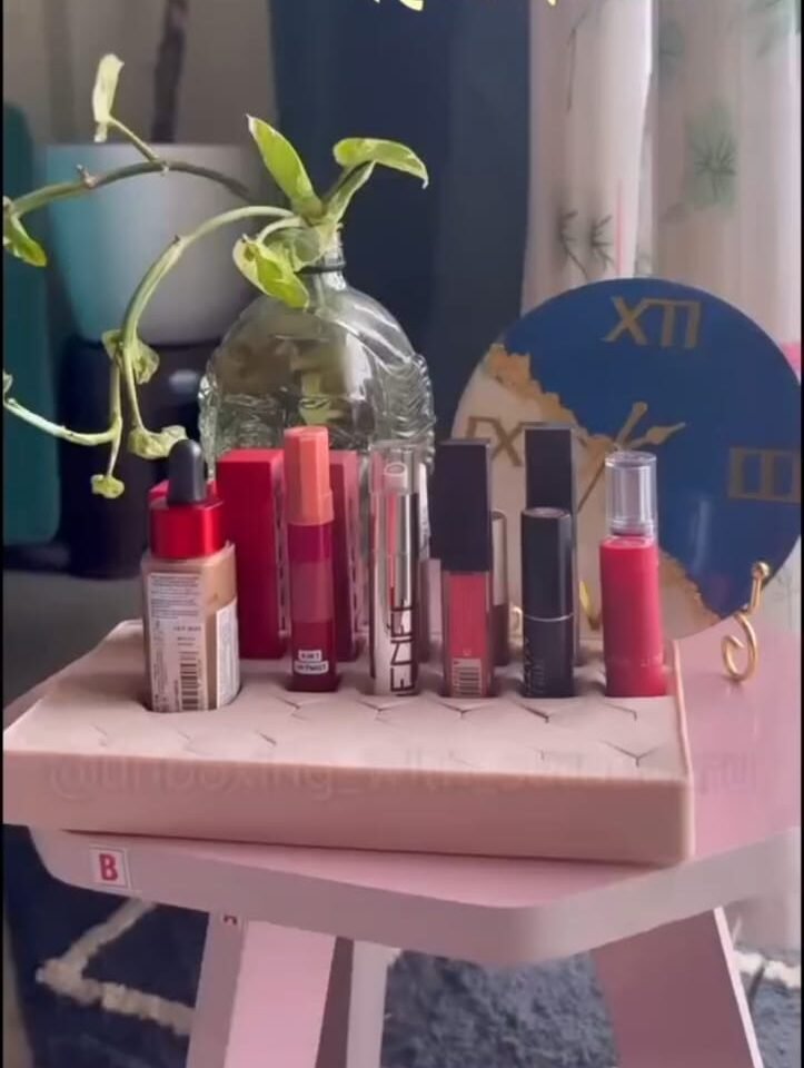 A collection of lipsticks and lip gloss tubes in various shades of red and pink are neatly arranged on top of a small pastel pink stool. Behind them, a clear glass jar holds a green leafy plant, adding a fresh touch to the scene. A decorative blue clock with Roman numerals is partially visible in the background, creating a cozy and aesthetic tabletop setup. The overall arrangement gives a stylish, feminine vanity display vibe.