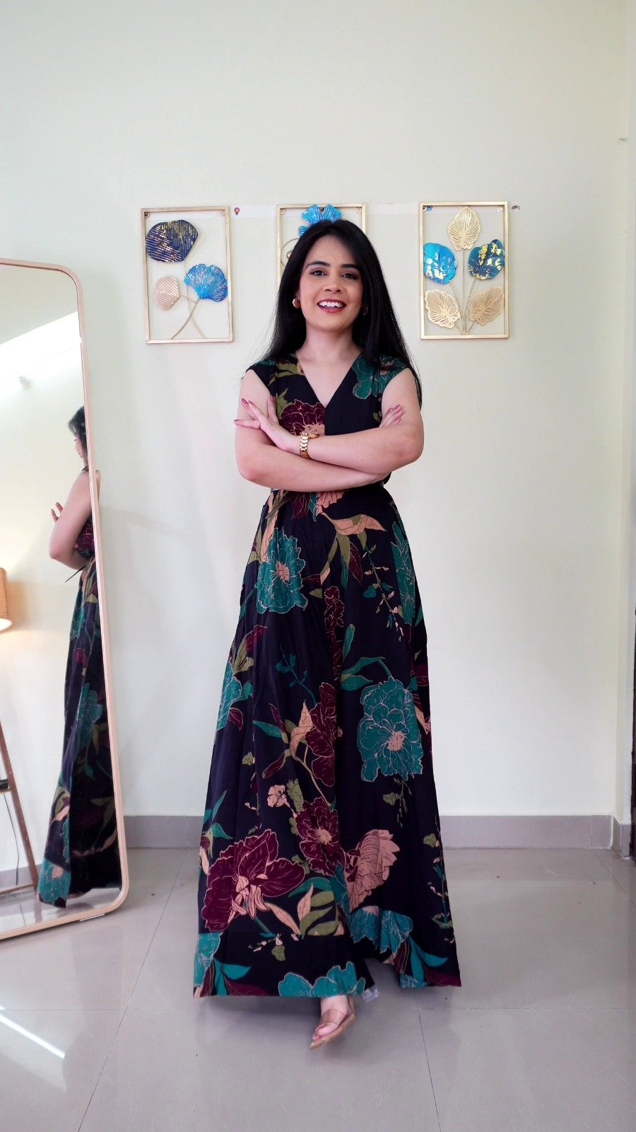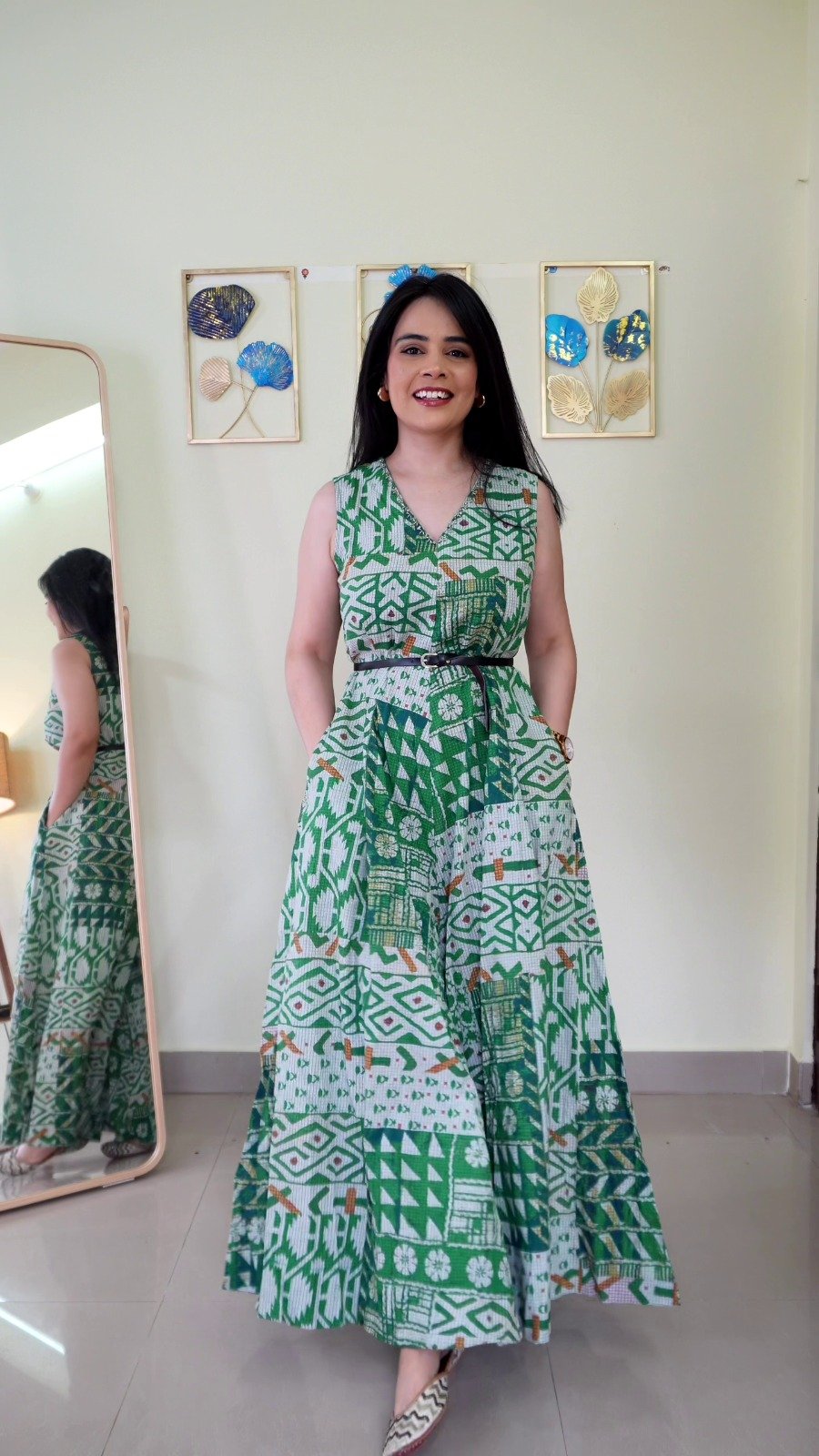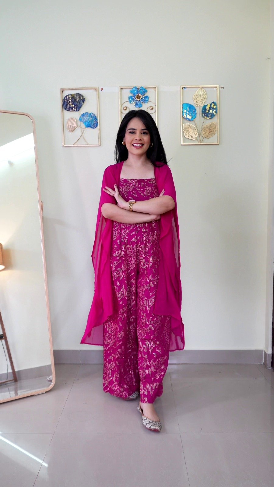 Styled with minimal accessories and natural makeup, the look maintains a fresh and effortless appeal. The soft indoor setting, complemented by decorative wall art and a standing mirror, adds a lifestyle aesthetic that enhances the outfit’s charm.