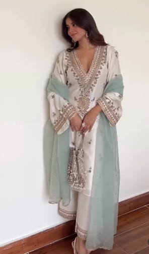 This pastel kurta set features intricate embroidery along the neckline, sleeves, and hemline, paired with matching straight pants. The soft chiffon dupatta in a subtle mint shade adds a graceful touch. Perfect for festive occasions, weddings, or formal gatherings, this outfit blends traditional elegance with contemporary charm.