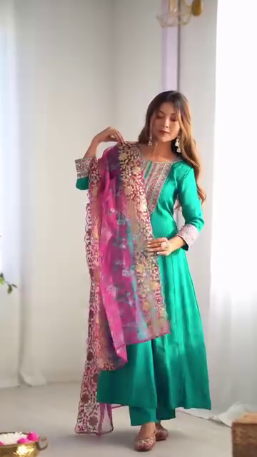 A woman radiates grace in a flowing emerald green Anarkali suit accented with intricate embroidery along the neckline and sleeves. She pairs the outfit with a vibrant pink floral dupatta richly detailed with gold patterns, adding a striking contrast to the look. Set in a softly lit space with natural light streaming in, the ensemble captures timeless festive charm and refined traditional beauty.