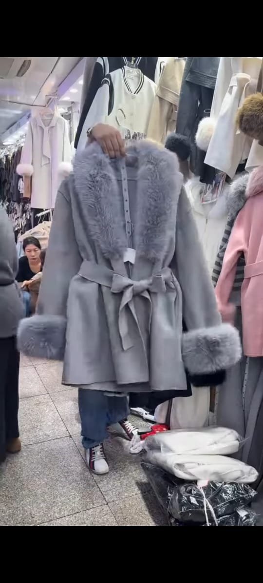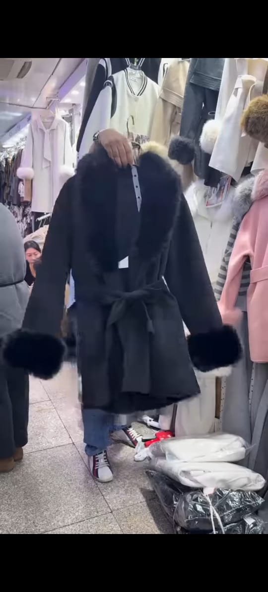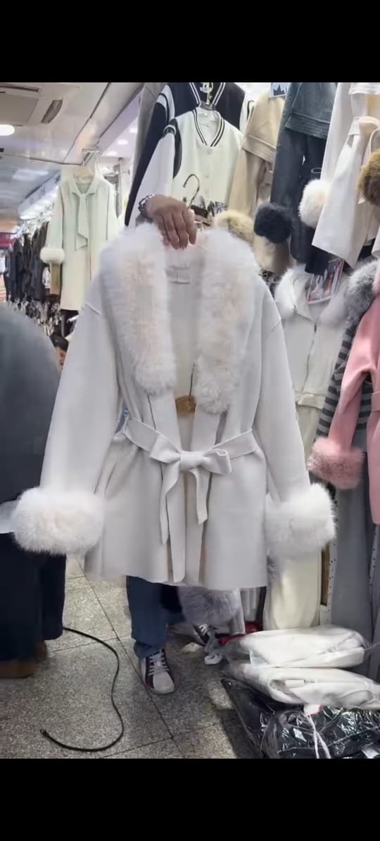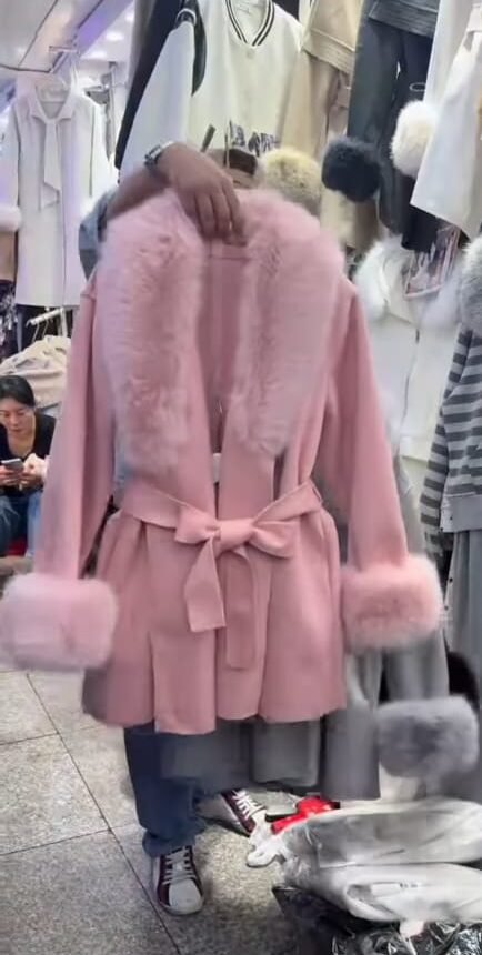 The image features a stylish pink winter coat being held up in a clothing shop. The coat has a luxurious look, with soft faux-fur trim along the collar and cuffs, adding warmth and elegance. It includes a matching belt tied at the waist, creating a fitted silhouette. The background shows various other winter garments, indicating that the setting is a boutique or market stall specializing in cozy seasonal fashion.