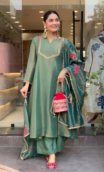 A woman styled in an elegant green ethnic suit set featuring subtle patterns and contrast detailing on the neckline and sleeves. The outfit is paired with a matching dupatta and straight pants, complemented by statement earrings and traditional footwear. She carries a small embellished potli bag, creating a polished festive look perfect for celebrations and special occasions.