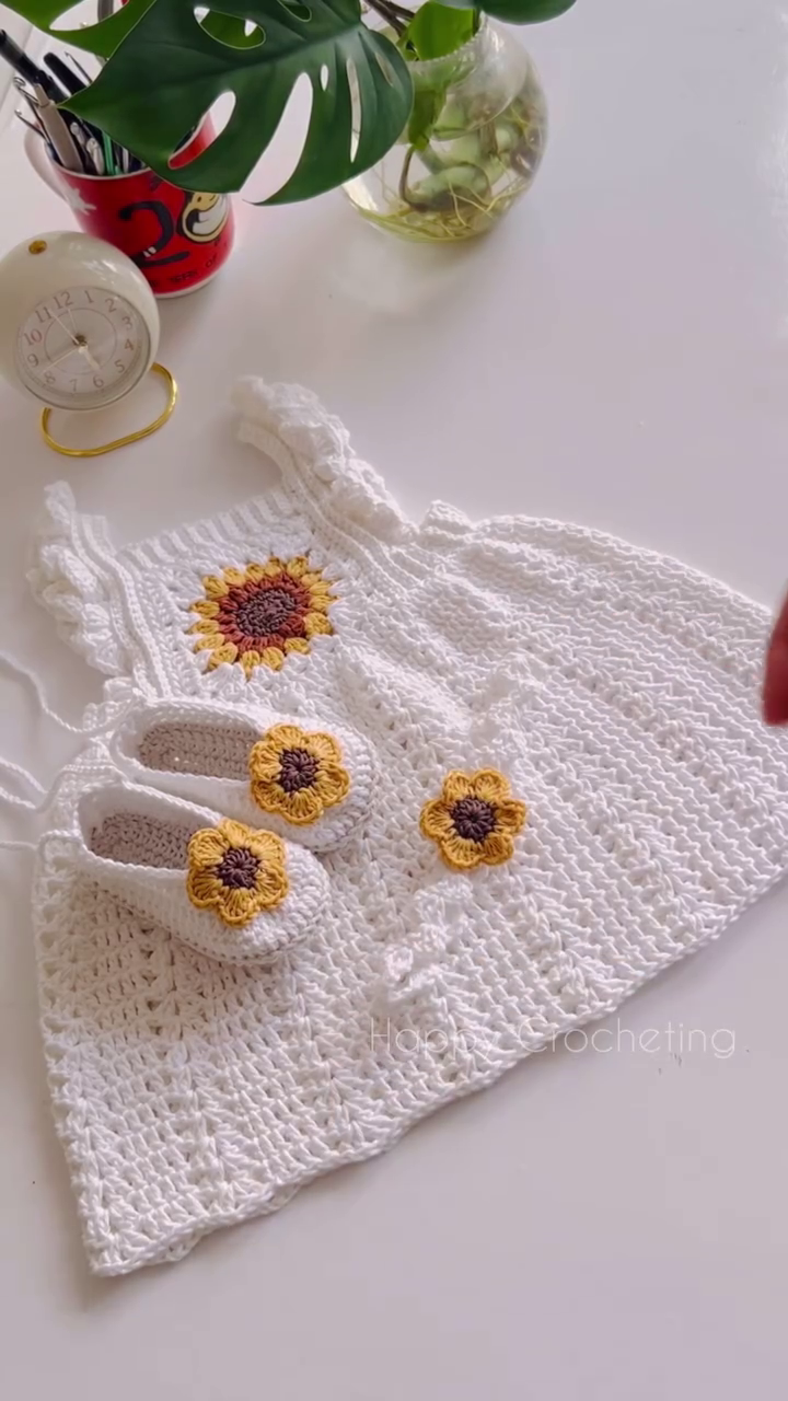 This premium set includes matching sunflower crochet booties, lovingly designed to complement the dress. These booties feature:
