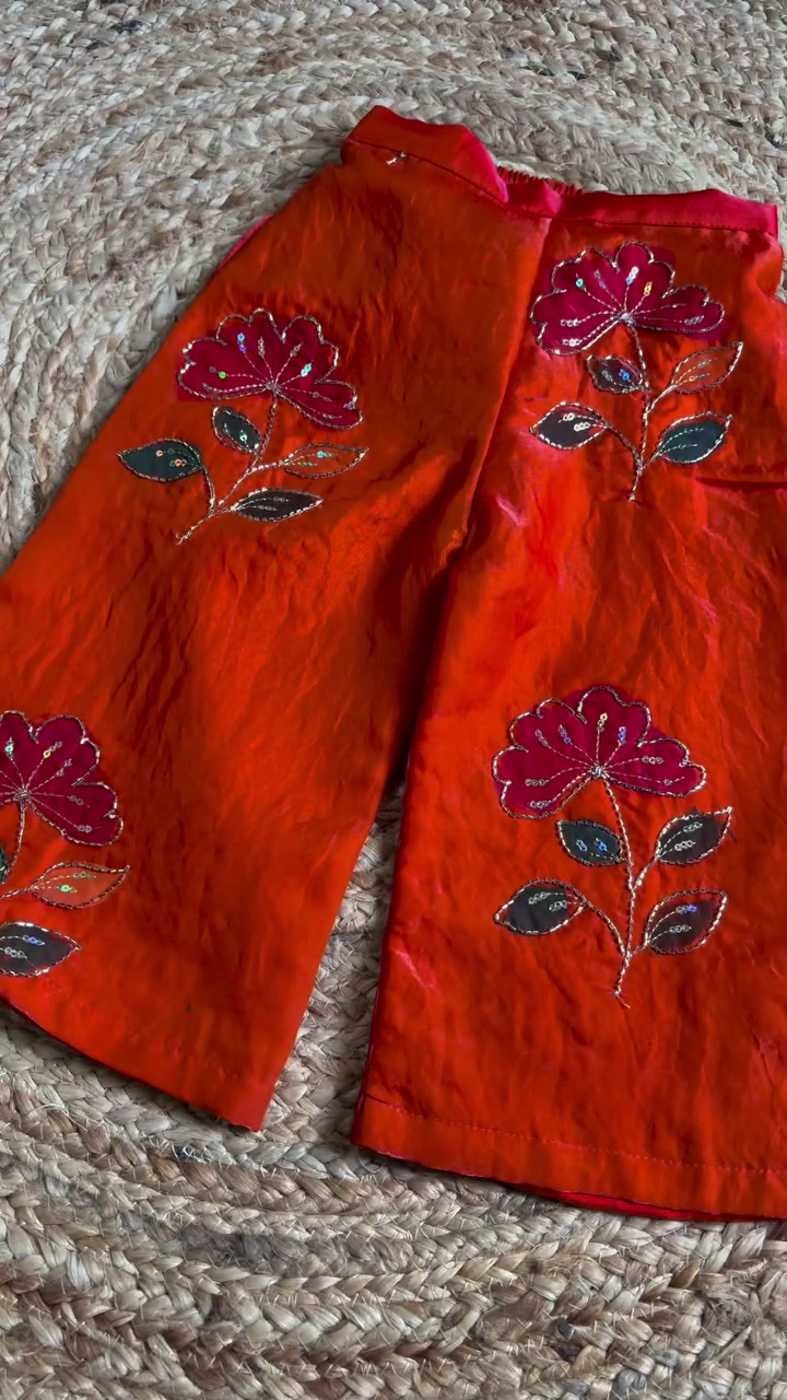 Crafted from premium-quality fabric, this kids kurta pajama set offers a soft, breathable, and lightweight feel, making it ideal for long hours of wear. The rich orange base symbolizes warmth, joy, and festivity, while the intricate floral embroidery elevates the overall look with a handcrafted touch. Delicate threadwork and subtle sequin detailing create elegant floral motifs across the kurta and pajama, reflecting skilled artisan craftsmanship.