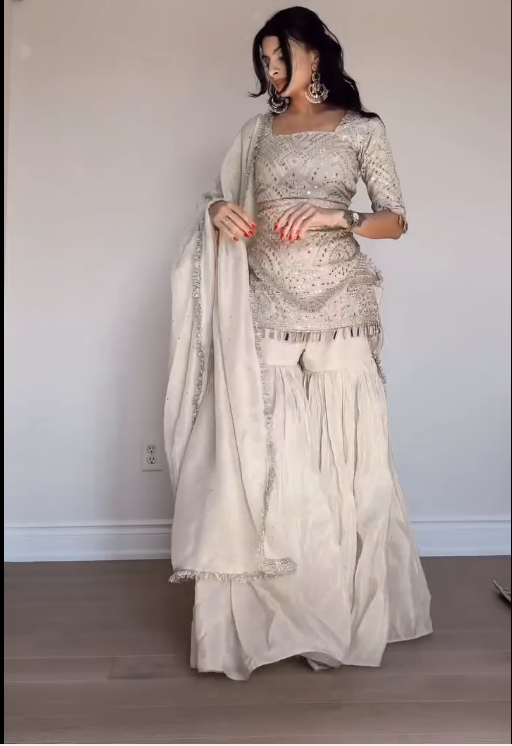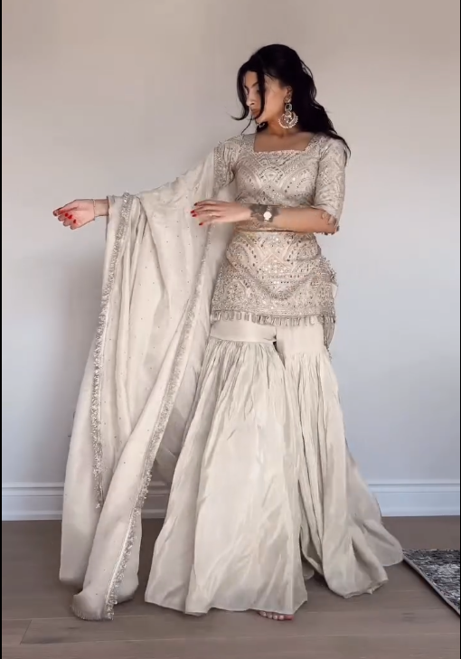 This ivory embroidered sharara set is designed for women who appreciate timeless ethnic fashion with a contemporary touch. Its detailed craftsmanship, elegant design, and versatile styling options make it a valuable addition to your ethnic collection. Whether you’re attending a wedding, festive celebration, or special family event, this sharara suit ensures you make a sophisticated and memorable style statement.