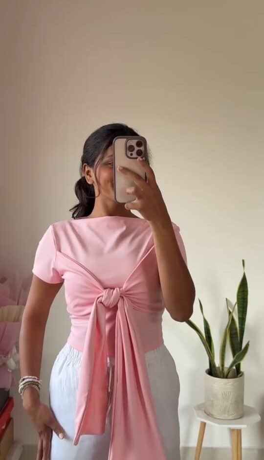 Description: A chic light pink top featuring a stylish front tie knot design that adds a playful twist to the classic tee. Perfect for casual outings, brunch dates, or pairing with high-waisted bottoms for a trendy look.