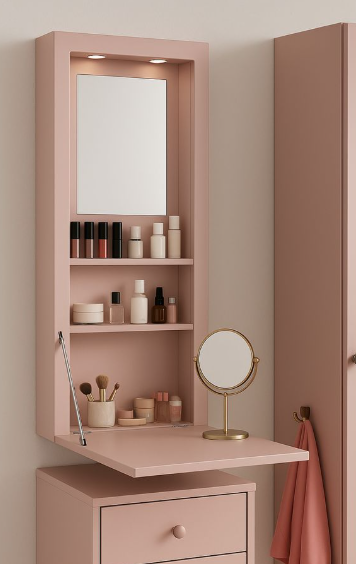 Charming pastel pink wall-mounted vanity unit with a built-in LED-lit mirror on the upper section for skincare and makeup storage, featuring open shelves to display bottles, jars, and serums. The lower fold-down panel opens to reveal a spacious vanity tabletop with a small round magnifying mirror, brush holder, and drawer for accessories. Space-saving design perfect for small bedrooms, bathrooms, or dressing areas, combining elegant storage with a functional lighted makeup station.