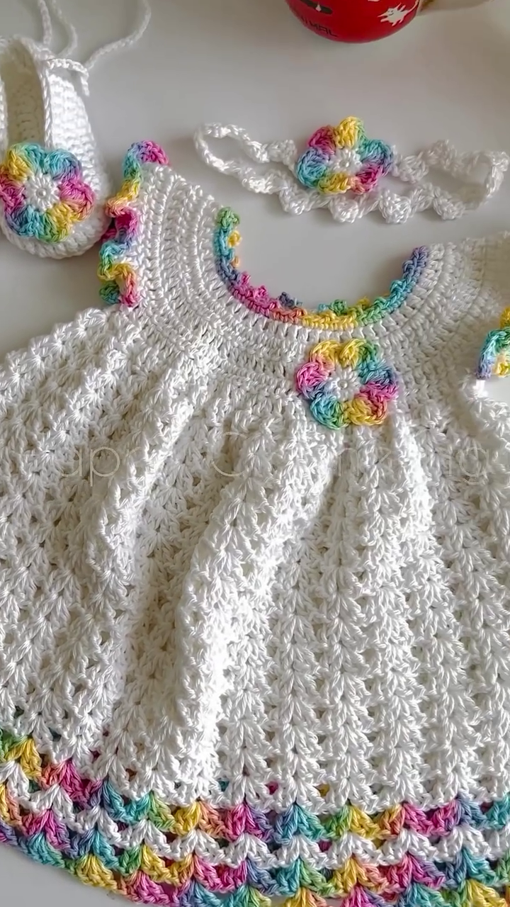 This crochet dress is highly Instagram-worthy and photoshoot-perfect. The soft white shade with pastel rainbow details looks stunning in both indoor and outdoor lighting. Whether you’re capturing milestone moments or planning a themed shoot, this dress adds a magical aesthetic to every frame.