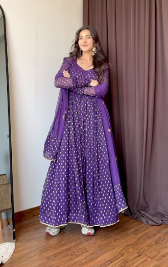 This royal purple Anarkali suit is adorned with golden foil prints, creating a regal and festive appeal. The flowing silhouette adds grace, while the matching dupatta enhances its elegance. Perfect for weddings, festive gatherings, and traditional celebrations, this outfit beautifully blends comfort with grandeur.