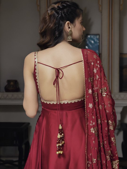 The set is completed with a beautifully coordinated dupatta that enhances the outfit’s grace. Crafted from lightweight fabrics like chiffon, georgette, net, or organza, the dupatta drapes effortlessly over the shoulders.
