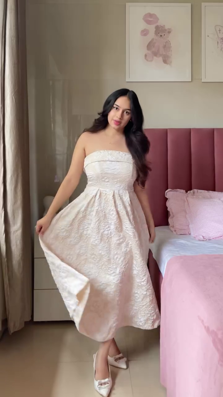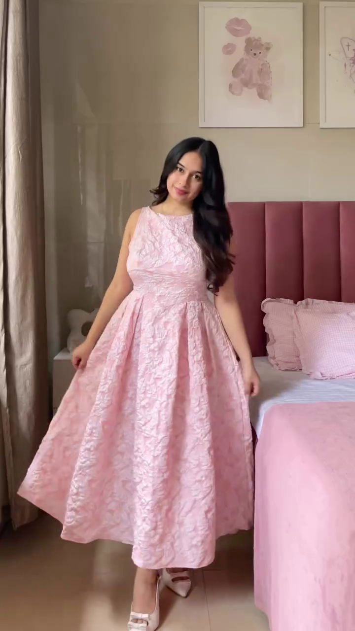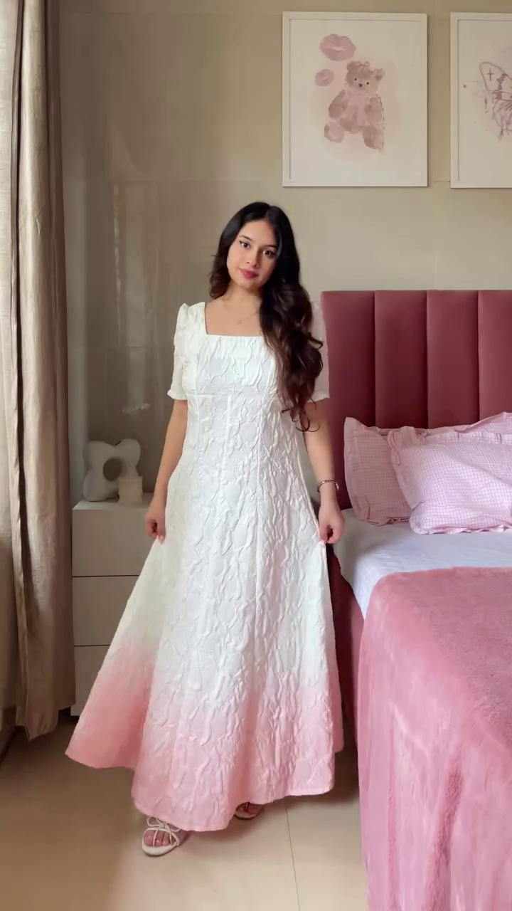 The A-line cut is universally flattering, helping define the waist and create a smooth, elegant drape. It accommodates different body shapes—pear, hourglass, rectangular, apple, or petite—ensuring a balanced and elongated appearance. With its airy flare and beautiful structure, the dress gives a delicate princess-like charm while maintaining comfortable simplicity.