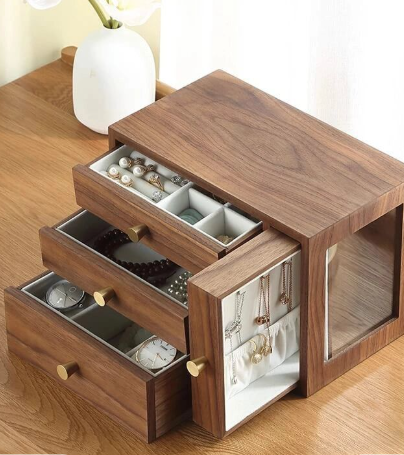 Elegant rectangular jewelry organizer crafted from rich walnut wood, featuring a sleek modern design with three pull-out drawers lined with soft fabric and divided compartments for rings, earrings, bracelets, and necklaces. Includes a side sliding glass door revealing hanging hooks for longer jewelry like chains and pendants. Top surface provides extra display space, accented with delicate gold knobs. Perfect for vanity, dresser, or bedside storage, combining sophisticated natural wood grain with practical, organized jewelry protection.