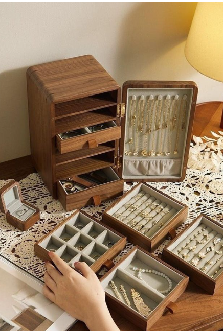 Luxurious rich walnut wood jewelry storage collection featuring a tall rectangular box with several pull-out drawers and divided compartments for rings, earrings, and small accessories, plus a hinged lid revealing padded necklace hooks and mirror. Includes matching smaller open trays with grid slots for organized display of bracelets, necklaces, and rings filled with delicate gold jewelry. Elegant natural wood grain finish with soft fabric lining, perfect for vanity, dresser, or bedside organization while showcasing your favorite pieces beautifully.