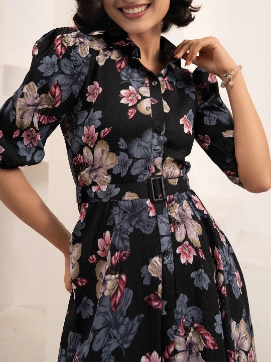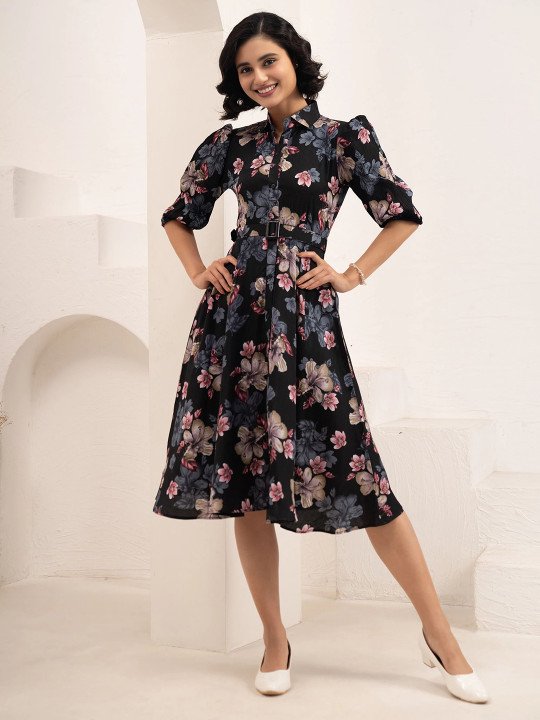 - Black floral print fit & flare dress