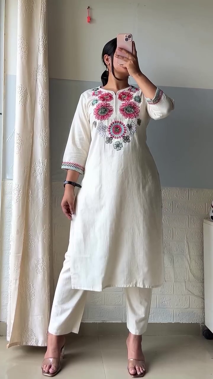 The kurta features a flattering straight silhouette with a notched neckline and three-quarter sleeves, making it both breathable and easy to wear throughout the day. Intricate embroidery along the neckline, cuffs, and front pockets enhances the overall design and adds visual interest without overwhelming the look. Functional front pockets also add convenience and practicality to the outfit.