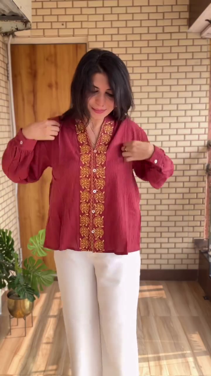 The lightweight fabric and breezy silhouette make it ideal for everyday wear, casual outings, brunch dates, vacations, and seasonal styling. The intricate all-over print gives the top a handcrafted, bohemian-inspired look, while the softly gathered waist creates a feminine shape that pairs beautifully with jeans, trousers, or skirts.