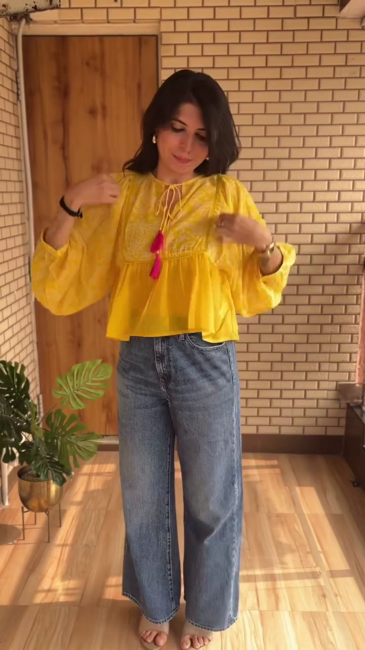 women’s boho printed top, mustard peplum blouse, floral casual top for women, puff sleeve boho blouse, printed peplum top, women’s ethnic print blouse, casual stylish top for jeans, bohemian women’s blouse, trendy printed top.