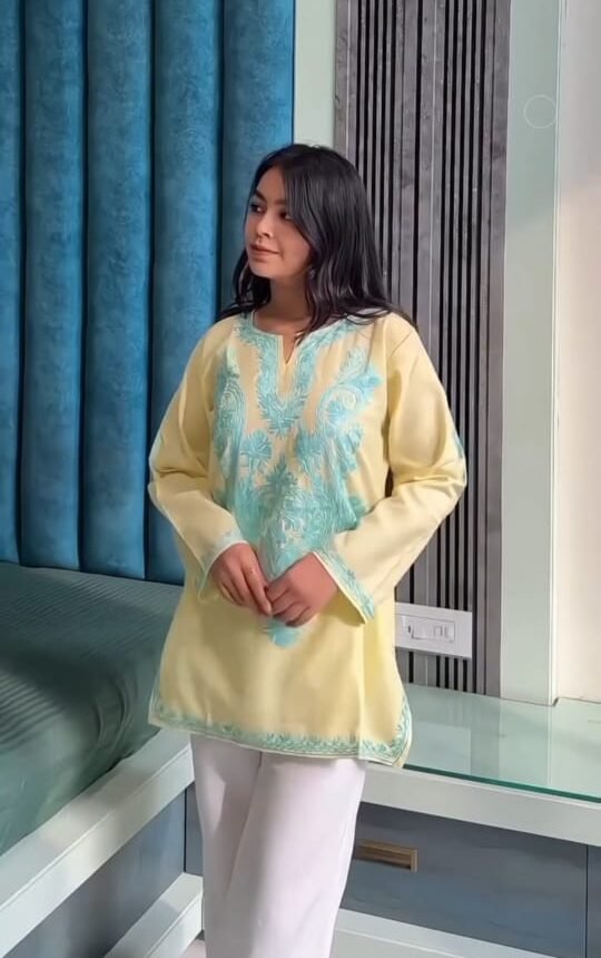 • Description: A soft yellow kurti adorned with intricate turquoise blue embroidery on the neckline and sleeves. The kurti features a relaxed fit with a straight hem and full sleeves, perfect for casual or semi-formal occasions.